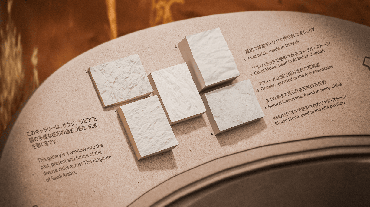 Lastly, we worked on a display of the different types of raw stones found in Saudi Arabia. Real samples will be fixed into a panel, allowing visitors to touch them and learn about where they can be found and how they are being used in construction.